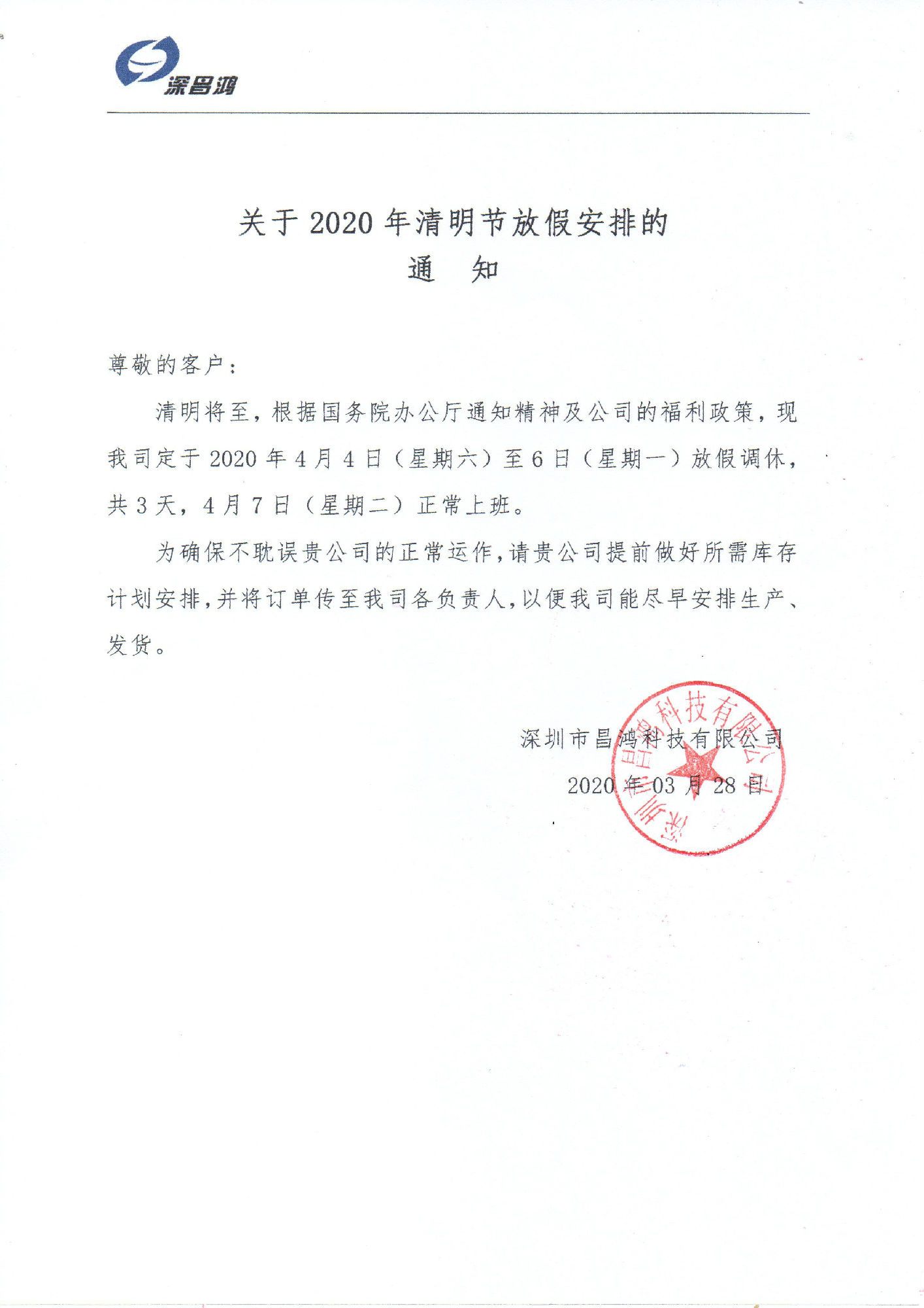 清明将至,根据国务院办公厅通知精神及公司的福利政策,现我司定于2020年4月4日(星期六)至6日(星期一)放假调休,共3天,4月7日(星期二)正常上班。