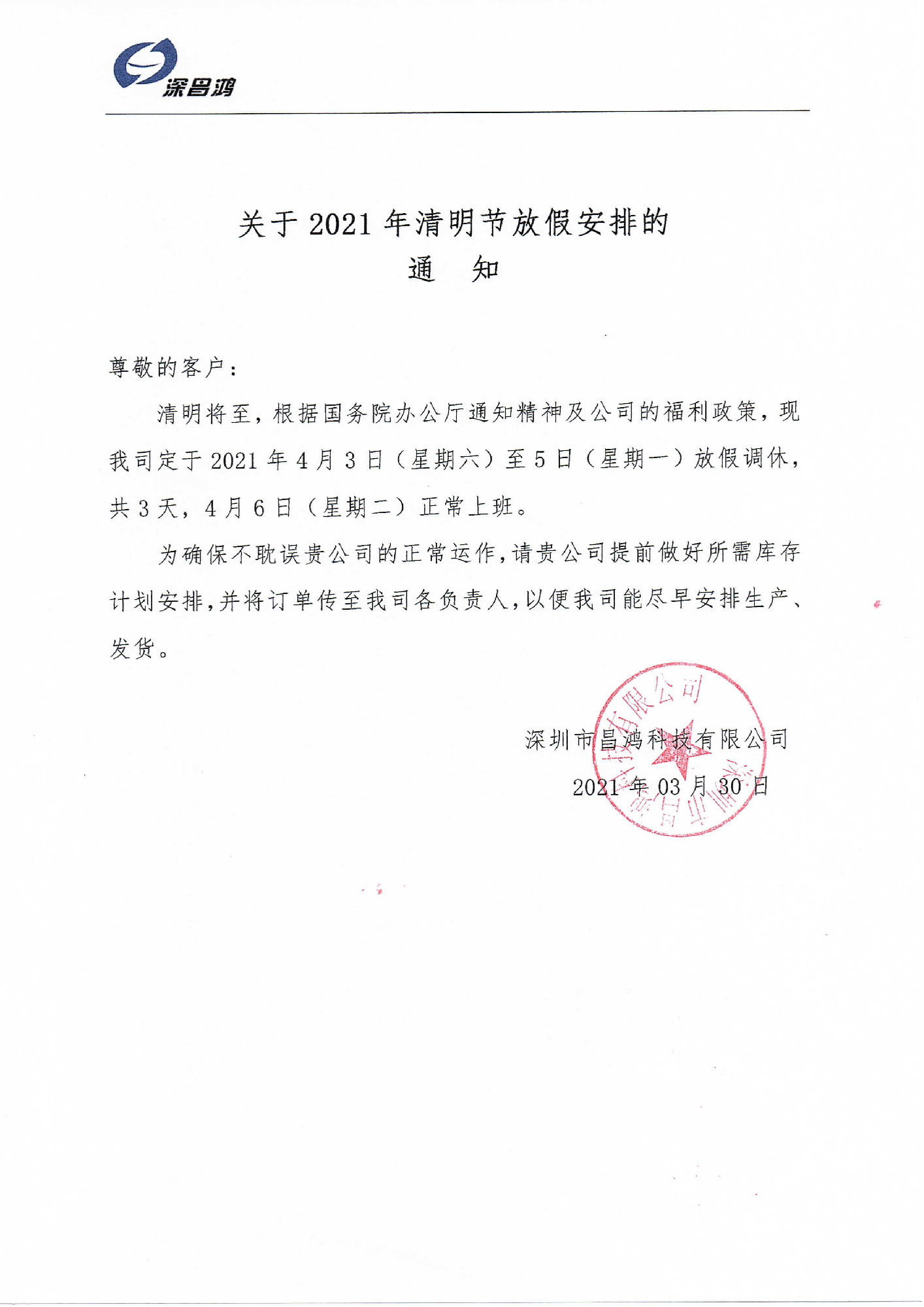 清明将至,根据国务院办公厅通知精神及公司的福利政策,现我司定于2021年4月3日(星期六)至5日(星期一)放假调休,共3天,4月6日(星期二)正常上班。