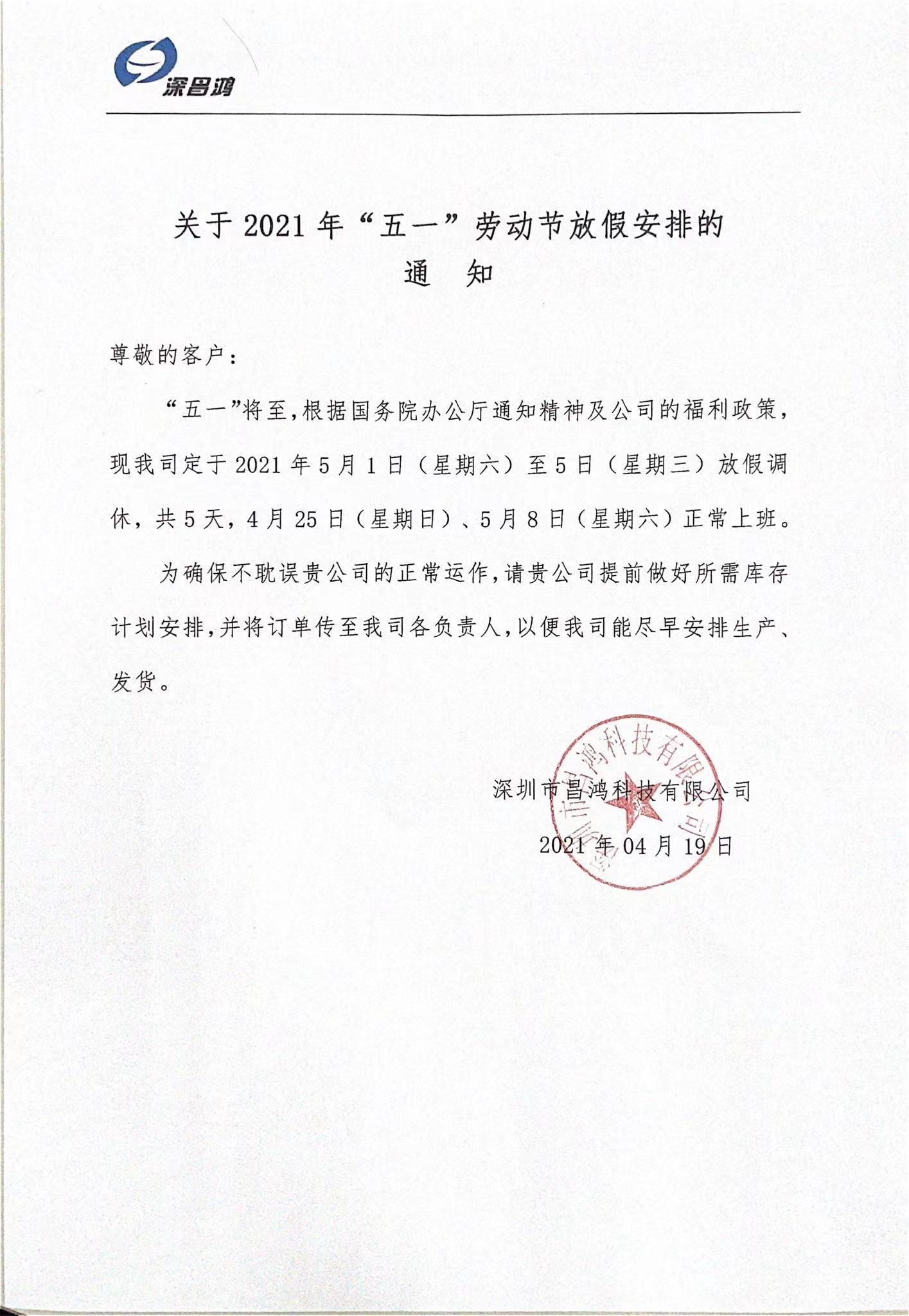 “五一”将至,根据国务院办公厅通知精神及公司的福利政策,现我司定于2021年5月1日(星期六)至5日(星期三)放假调休,共5天,4月25日(星期日)、5月8日(星期六)正常上班。