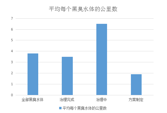 可以发现,相比于已经治理完成的水体和方案制定中的水体,治理中的水体平均每个的公里数明显偏高。