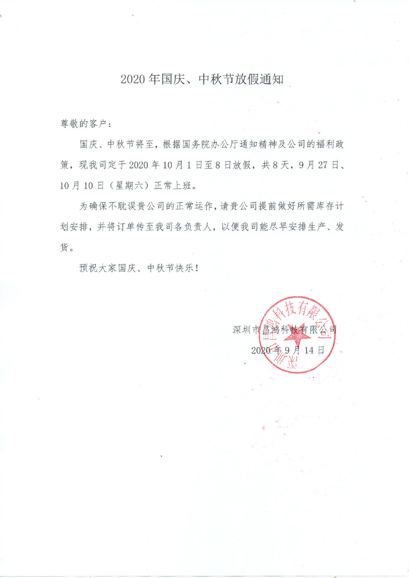 国庆、中秋节将至,根据国务院办公厅通知精神及公司的福利政策,现我司定于2020年10月1日至8日放假,共8天,9月27日、10月10日(星期六)正常上班。