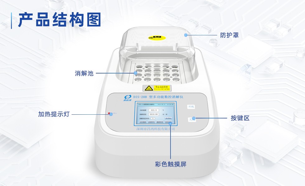 本仪器能实现地表水、工业废水、生活污水等各种水样中的COD、总磷、总氮及总铬等需要加热过程的化学分析消解功能。可同时放置20个φ16mm的反应管,根据设定的消解温度和消解时间自动控温。