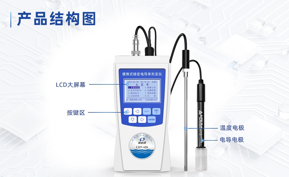 主机一台,电导电极1支,温度电极1支,电导标液1瓶,便携箱1个,充电电源1个,Type-c连接线1根,说明书、合格证、保修卡各1份。