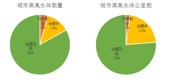 神彩v8 对比两张图发现,处于治理中的黑臭水体数量占总数量的比重为13%,而处于治理中的黑臭水体公里数占总公里数的比重为22%,上升了9%。