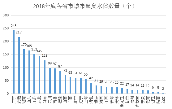 下图为依据全国城市黑臭水体整治监管平台数据而来的2018年各省市城市黑臭水体数量图: